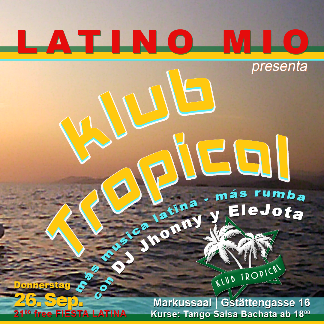 Der Sommer ist noch nicht vorbei und der Herbst wird heiss! Denn Klub Tropical öffnet wieder seine Pforten bei Latino Mio im Markussaal/Gstättengasse, gleich hinter dem Haus der Natur.